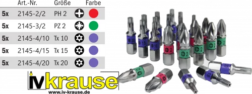 ![]() | Schrauberbits Set | S2-Stahl, farbcodiert, PH2, PZ2, Tx10, Tx15, Tx20 |