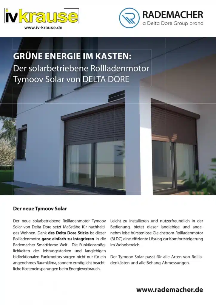Mit Tymoov Solar präsentiert Delta Dore eine innovative Lösung für die Automatisierung von Rollläden – solarbetrieben und smart steuerbar. Dieses System vereint Nachhaltigkeit, Komfort und Sicherheit in einem hochwertigen Produkt, das in Frankreich entwickelt und hergestellt wurde.