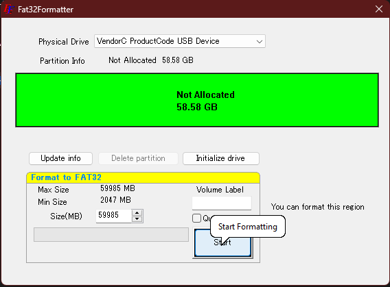 Der Fat32Formatter ist portabel und benötigt keine Installation. Er kann bspw. auch von einem USB-Stick gestartet werden, um damit Speichermedien von Messgeräten zu bearbeiten.